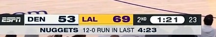2025-03-20 22:49:26半场掘金失误14次&湖人10次 利用失误得分湖人23-16掘金